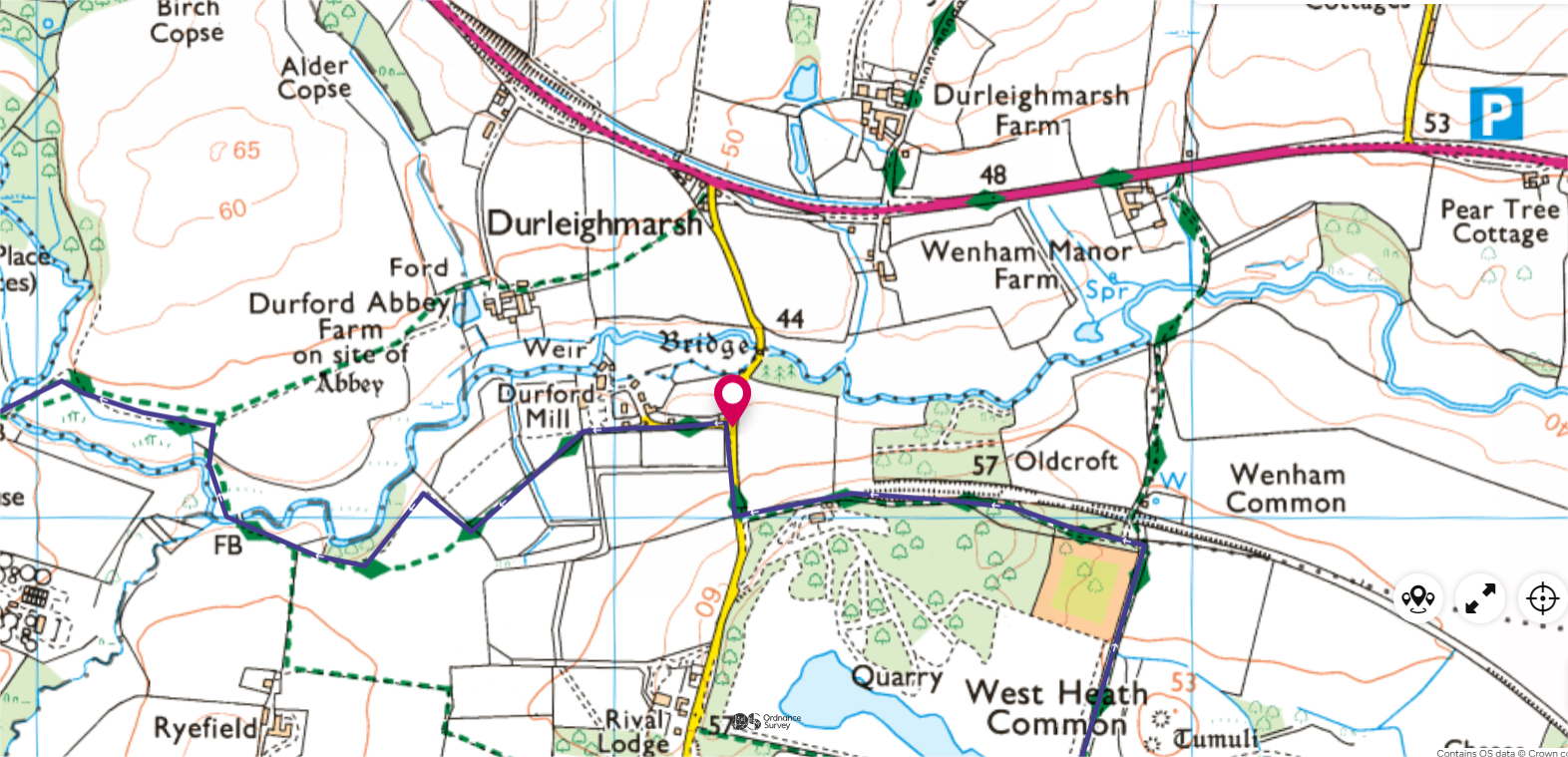 The route comes down the road to this point and then turns LEFT onto the small lane, to Durford Mill. (run route in blue line on map)